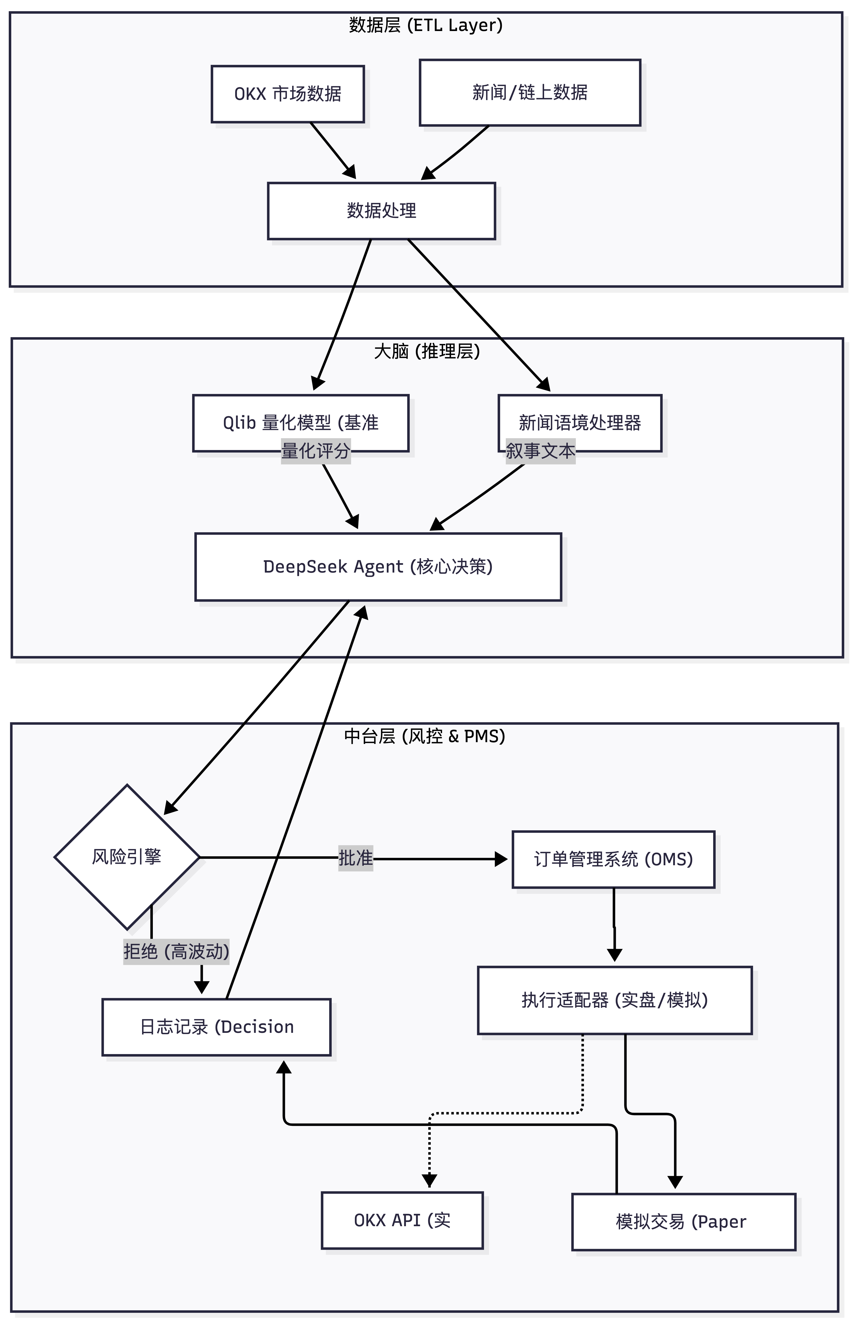 - 风控层:设计了独立于AI的、严格执行的系统规则,通过“三道防线”——波动熔断、宏观敞口管理和持仓集中度限制——为资产安全提供最终保障。