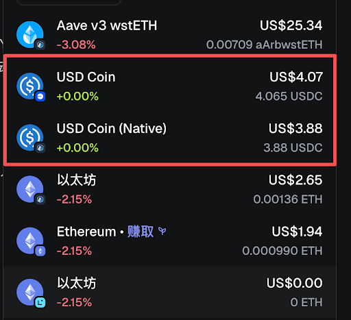 - 官方桥后遗症:通过官方 Arbitrum Bridge 跨过来的 USDC,默认生成的全是桥接版(USDC.e)。